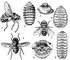 Овода. Желудочные: 1 — Gasterophilus intestinalis (самка); 2 — личинка 3-й стадии G. pecorum; 3 — передний конец её тела. Подкожные: 4 — Oestroderma potanini (самец); 5 — личинка 3-й стадии Oedemagena torandi; 6 — передний конец её тела. Носоглоточные: 7 — Oestrus ovis (самка); 8 — её личинка 3-й стадии.