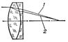 Схема ахромата. Тонкими линиями показан ход лучей: 1 — в жёлтой области спектра; 2 — в сине-фиолетовой области спектра.