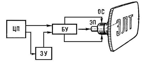 Рис. 1. Схема устройства отображения на ЭЛТ: ЦП — центральный процессор вычислительной системы; ЗУ — вспомогательное запоминающее устройство; БУ — блок местного управления; ЭП — электронный прожектор; ОС — отклоняющая система.