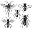 Перепончатокрылые: 1 — большой хвойный рогохвост, самка; 2 — наездник (акациевый семяед); 3 — роющая оса (пчелиный волк); 4 — муравей (рабочая особь); 5 — настоящая оса (шершень).