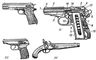 Пистолет ы: I — образца 1951 конструкции И. Я. Стечкина; II — образца 1951 конструкции Н. Ф. Макарова в разрезе (положение частей и механизмов перед выстрелом): 1 — ствол, 2 — затвор, 3 — мушка, 4 — целик, 5 — рамка, 6 — курок, 7 — шептало, 8 — боевая пружина, 9 — спусковая тяга, 10 — спусковой крючок, 11 — возвратная пружина, 12 — магазин, 13 — ударник, 14 — выбрасыватель, 15 — рукоятка, 16 — пистолетный патрон; III — американский пистолет «Кольт» M1911A1; IV — русский кремнёвый пистолет образца 1828.