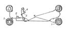 Тормозная система автомобиля ЗИЛ-110: 1 — тормозной механизм колёс; 2 — главный тормозной цилиндр; 3 — педаль тормоза; 4 — рукоятка ручного тормоза.