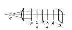 Рис. 2. Схема кругового полярископа: S — источник света, Р — поляризатор; D — пластинка; l/4 — компенсирующие пластинки; А — анализатор; Э — экран.