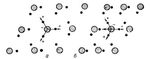 Рис. 1. а — плоская модель кристалла, не имеющего центра симметрии; центры тяжести положительных и отрицательных зарядов совпадают, стрелки изображают отдельные электрические дипольные моменты одной группы зарядов; б — тот же крисстал, подвергнутый сжатию, при котором изменяются длины связей между зарядами каждой группы, но не углы между ними; горизонтальная стрелка слева — суммарный электрический дипольный момент одной группы зарядов.