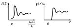 Рис. 4. Дебаеграмма (а) аморфного твёрдого тела (или жидкости, расплава) и график (б) изменения распределения r(r) атомной плотности Hg с расстоянием r от центра неупорядоченного скопления. Появление нескольких первых размытых максимумов интенсивности I(S) (где