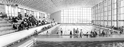 Зимний плавательный бассейн ЦСКА в Москве на Ленинградском проспекте. 1954. Архитекторы Б. И. Аверинцев, Н. И. Гайгаров и др., инженер-конструктор П. Аксёнов.