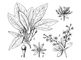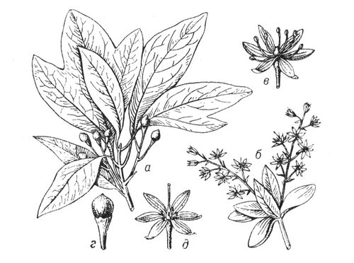 Сассафрас беловатый: а — ветка с плодами; б — ветка с цветками; в — тычиночный цветок; г — плод; д — пестичный цветок.