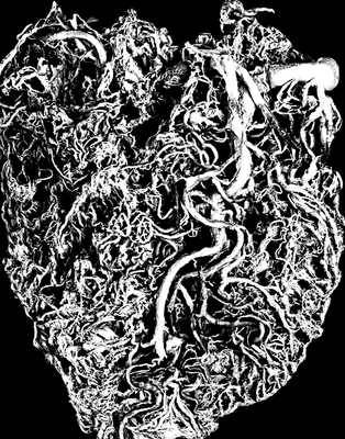 Рис. 6а. Кровеносные сосуды задней стенки здорового сердца (инъецированы цветным латексом). По С. В. Самойловой.