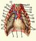 Сердце, вид сзади: 1 — верхушка сердца; 2 — левый желудочек; 3 — венечная пазуха сердца; 4 — левое ушко; 5 — левые лёгочные вены; 6 — перикард (отрезан); 7 — правая и левая лёгочные артерии; 8 — дуга аорты; 9 — верхняя полая вена; 10 — правые лёгочные вены; 11 — левое предсердие; 12 — правое предсердие; 13 — нижняя полая вена; 14 — правая венечная артерия; 15 — задняя межжелудочковая ветвь; 16 — правый желудочек.