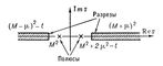 получающуюся из (1) переносом символа p-мезона из одной части равенства в другую с одновременной заменой частицы (p+) на античастицу (p-) и знаков их четырёхмерных импульсов: р ® -р, p' ® -p'. При переходе от процесса (I) к процессу (II) переменная t остаётся неизменной, а s и и меняются местами. Физической области обоих процессов соответствуют двум различным неперекрывающимся областям изменения кинематических переменных s, и. Доказательство Боголюбовым аналитичности амплитуды в комплексной плоскости переменной s позволяет утверждать, что амплитуды процессов I и II являются предельными значениями единой аналитической функции Ft (s) в разных областях изменения переменной s с разрезами на вещественной оси (рис. 4). Правый разрез определяется условием s ³ (М + m)' (где М и m, — массы протона и пиона), а левый разрез — условием u = 2M 2 + 2m2 - s - t ³ (M + m2). На «верхнем берегу» правого разреза Ft (s) совпадает с амплитудой T (s, t) процесса (I):