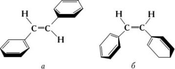 Для проявления С. с. необходимо, чтобы участвующие в нём электронные системы находились в одной плоскости. Если структура молекулы не допускает этого, то говорят о пространственных препятствиях сопряжению. Так, у транс-стильбена (а), по данным УФ-спектров, обнаруживается более сильное сопряжение, чем у цис-стильбена (б), у которого бензольные ядра не могут разместиться в одной плоскости с двойной связью: