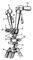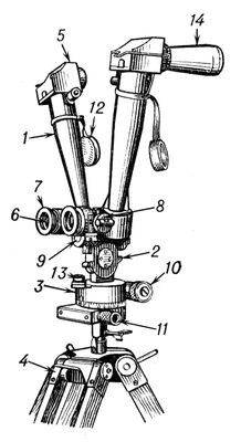 Стереотруба: 1 — зрительная труба; 2 — держатель; 3 — лимб; 4 — тренога; 5 — головки зрительных труб; 6 — окуляры; 7 — резиновые накладки; 8 — механизм уровня для вертикальной наводки; 9 — шкала расстояний между окулярами; 10 — барабан верхнего (отсчетного) червяка; 11 — маховик нижнего (установочного) червяка; 12 — кожаные покрышки; 13 — круглый уровень; 14 — оптическая насадка.