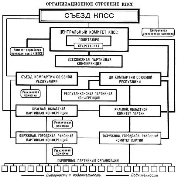 Верховным органом КПСС является съезд партии. Съезд избирает Центральный комитет (ЦК) и Центральную ревизионную комиссию. Очередные съезды созываются не реже 1 раза в 5 лет. В промежутках между съездами всей деятельностью партии руководит ЦК КПСС. ЦК КПСС избирает: для руководства работой партии между Пленумами ЦК — Политбюро; для руководства текущей работой, главным образом по подбору кадров и организации проверки исполнения, — Секретариат. ЦК избирает Генерального секретаря ЦК КПСС. ЦК КПСС организует при ЦК Комитет партийного контроля.