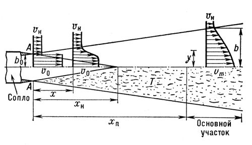 В начальном участке С. при х < хн расширяющийся пограничный слой ещё не достигает оси течения; скорость v вблизи оси постоянна и равна скорости на срезе сопла. В переходном участке С. хн < х £ хп вязкое перемешивание распространяется на весь объём С., скорость течения на оси уменьшается, но профили скоростей ещё не устанавливаются. В основном участке С. (х > хп) скорость течения на оси продолжает уменьшаться, а профили относительной скорости Dv /Dvm = f (y/b) становятся неизменными (автомодельными) (Dv = v —vv н,Dvm = vm—vvн — избыточные скорости в рассматриваемой точке течения и на оси С.). Уширение С. на основном участке так же, как и расширение пограничного слоя в начальном участке турбулентной С., пропорционально среднему значению степени турбулентности течения