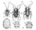 Таракановые: 1 — прусак Blatella germanica (самка с оотекой); 2, 3 — чёрный таракан Blatta orientalis (2 — самец, 3 — самка с оотекой); 4 — техасский муравьелюб Attaphila fungicola, живущий в гнёздах муравьев-листорезов; 5 — филиппинский таракан Prosoplecta semperi (а), имитирующий божью коровку Leis dunlopi (б).