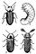 Точильщики: 1, 2 — обыкновенный точильщик и его личинка; 3 — хлебный точильщик; 4 — гребнеусый точильщик (Ptilinus pectinicornis).