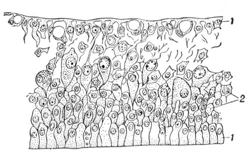 Разрез через тело трихоплакса: 1 — слой наружных жгутиковых клеток; 2 — паренхима.