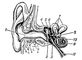 Схема строения уха человека: 1 — наружный слуховой проход; 2 — барабанная перепонка; 3 — полость среднего уха (барабанная полость); 4 — молоточек; 5 — наковальня; 6 — стремечко; 7 — полукружные каналы; 8 — преддверие; 9 — улитка; 10 — овальное окно; 11 — евстахиева труба.