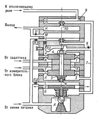 На рис. 2 показан общий вид регулирующего блока А. у. с., содержащего наибольшее количество унифицированных узлов и деталей. Большинство блоков строится по этому типу.Его принципиальную схему см. на рис. 3. Работа блока основана на компенсации усилий, возникающих на мембранах от давления сжатого воздуха, подводимого к камерам блока — пространствам, образованным стенками шайб и мембранами. Регулирующий блок — изодромный (пропорционально-интегральный) регулятор с настройкой диапазона дросселирования от 10 до 250% и времени изодрома от 3 сек до 100 мин. Блок состоит из узлов: усилителя мощности (камеры А, Б, В и Г), элемента сравнения (камеры Е и Ж), обратной связи (камеры Д и К), элемента изодрома (камеры Л и М) и отключающего реле (камеры Н, О и П). К блоку подводится сжатый воздух из линии питания, от измерительного блока (датчика) и от задающего устройства. При отклонении регулируемого параметра от заданного значения возникает разность давлений воздуха на входах блока, в результате чего нарушается баланс сил, действующих на мембраны 1, 2, 3, скрепленные общим штоком 4. В зависимости от направления результирующего усилия мембранный узел перемещается вверх или вниз. При этом заслонка 5, находящаяся на нижнем конце штока 4, открывает или закрывает сопло 6, вследствие чего давление сжатого воздуха, поступающего из линии питания блока через постоянное сопротивление, изменяется. Изменение этого давления усиливается усилителем и поступает в канал 7 и выходную линию блока, связанную с линией исполнительного механизма. Отрицательная обратная связь реализуется подачей сжатого воздуха в камеру Д. Значение коэффициента усиления регулятора (диапазона дросселирования) устанавливается настройкой дросселя 8, регулирующего поступление сжатого воздуха из канала 7 в камеру положительной обратной связи К. Элемент изодрома состоит из глухой камеры М с дросселем 11 и проточной камеры Л, в которой давление сжатого воздуха всегда следит за давлением в камере М. Время изодрома устанавливается дросселем 11, от степени открытия которого зависит время заполнения камеры М. Дроссели 8 и 11 представляют собой игольчатые клапаны. Для перехода с автоматического управления на ручное служит отключающее реле, в котором при подаче воздуха питания в камеру П мембрана 9 перекрывает сопло 10, отсоединяя выходную линию регулятора от линии исполнительного механизма.