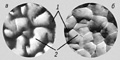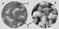 Микрофотографии участков печатной формы (до нанесения краски): а — темные участки; б — светлые участки; 1 — углубления между складками; 2 — 2 складки.