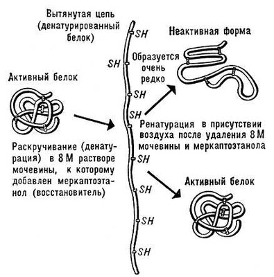 Рис. 2. Схема денатурации и ренатурации глобулярного белка (на примере фермента рибонуклеазы).