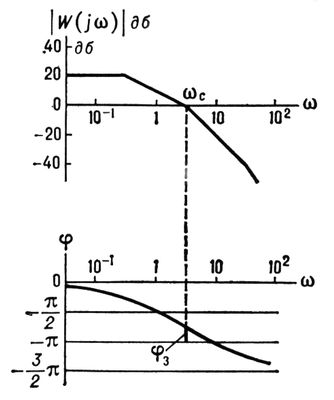 Используя критерий Найквиста, можно судить об устойчивости замкнутой линейной системы (т. е. системы с обратной связью) по АФХ разомкнутой системы: замкнутая система устойчива, если АФХ разомкнутой системы не охватывает критической точки с координатами — 1,0 (рис. 1). Устойчивость замкнутой системы можно оценивать и непосредственно по ЛАЧХ и ЛФЧХ разомкнутой системы: замкнутая система устойчива, если запас по фазе j3 = p — ½j(w) с½положителен (рис. 2) (wс — частота среза, при которой ЛАЧХ пересекает ось абсцисс). Частота среза может служить мерой быстродействия системы, а запас по фазе — мерой степени затухания свободных колебаний в ней. На базе логарифмических частотных характеристик и критерия Найквиста развиты весьма эффективные методы синтеза корректирующих устройств, обеспечивающих требуемые динамические свойства замкнутой системы. Аналогичные Ч. м. были разработаны для анализа и синтеза линейных импульсных систем. Качественные показатели переходного процесса в линейной системе оценивают по переходной характеристике, выражающей реакцию системы на входной скачкообразный сигнал. Советский учёный В. В. Солодовников предложил методы построения и оценки свойств переходной характеристики по вещественной частотной характеристике Р (w)=ReW (jw). Для нелинейных замкнутых систем на основе Ч. м. советский учёный Л. С. Гольдфарб разработал критерий существования и устойчивости автоколебаний, румынский математик В. М. Попов предложил критерий абсолютной устойчивости.
