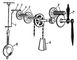 Рис. 4. Схема механизма маятниковых часов с крючковатым спуском: 1 — поводок; 2 — ось скобы; 3 — скоба; 4 — спусковое колесо; 5 — основная колёсная передача; 6 — колёсная передача стрелок; 7 — стрелки; 8 — гиревой привод; 9 — маятник.