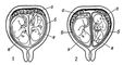 Двойня: 1 — однояйцевая; 2 — двуяйцевая (а — плацента; б — ворсинчатая оболочка; в — водная оболочка).