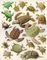 Черепахи. 1. Глазчатая украшенная. 2. Украшенная д’Орбиньи. 3. Флоридская украшенная. 4. Звездчатая. 5. Средиземноморская. 6. Мускусная. 7. Расписная. 8. Африканская леопардовая. 9. Кожистая. 10. Бисса. 11. Зелёная суповая. 12. Красноухая. 13. Индийская кровельная. 14. Дальневосточная. 15. Каспийская, с брюшной стороны. 16. Она же, со спинной стороны. 17. Грифовая. 18. Болотная. (9,10, 11 — молодые особи.)