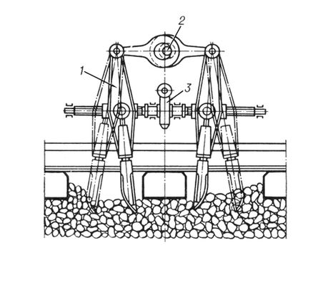 Схема рабочего органа шпалоподбивочной машины: 1 — подбойка: 2 — эксцентриковый вал; 3 — механизм обжатия.