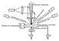 Устройство растрового Э. м. показано на рис. 4. При помощи 2 или 3 ЭЛ на поверхность образца фокусируется узкий электронный зонд. Магнитные отклоняющие катушки развёртывают зонд по заданной площади на объекте. При взаимодействии электронов зонда с объектом возникает несколько видов излучений (рис. 5) — вторичные и отражённые электроны; электроны, прошедшие сквозь объект (если он тонкий); рентгеновское тормозное излучение и характеристическое излучение; световое излучение и т. д.