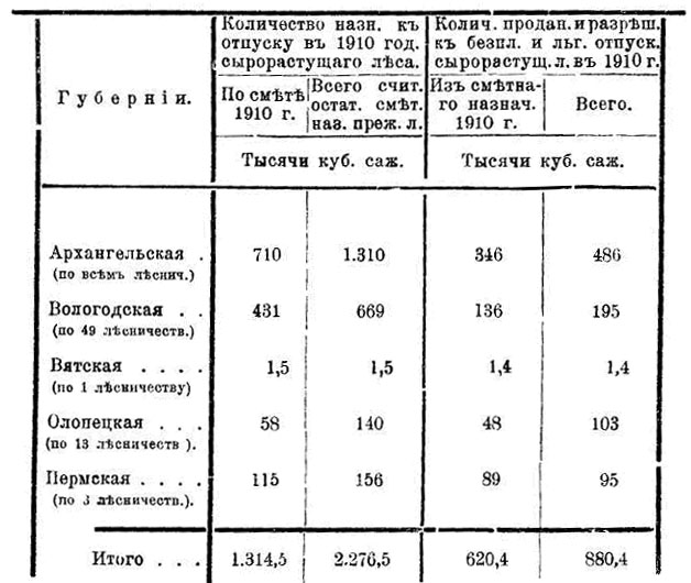 Впрочем, сообразно данным труда "Казенное лесное хозяйство в Архангельской и Вологодской губерниях", это количество пиловочных деревьев, возможных к ежегодному отпуску, могло бы быть еще значительно увеличено. Дело заключается в том, что, по объяснению авторов названной работы, при изследовании лесов упомянутых губерний, на определение площадей,