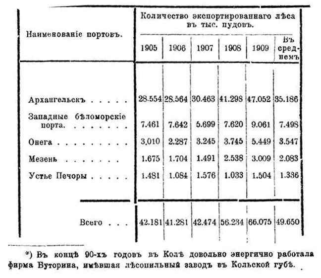 Вместе с тем экспорт пиленаго леса из Беломорских портов занял довольно важное место в общем экспорте пиленаго товара из России заграницу. Так, из 185,5 мил. пуд. досок, вывезенных в 1909 г., из Беломорских было экспортировано — 46,2 мил. пуд. или 25% от общаго вывоза. Притом эта цифра имеет несомненную тенденцию к повышению, в связи с возрастающей деятельностью заводов и полным отпуском леса из дач Севера.