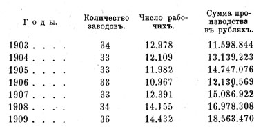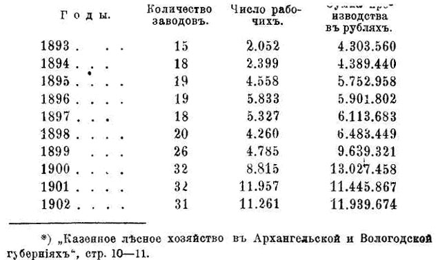 Из этих данных видно, что в последние 15 лет (с 1895 по 1909 г.) число лесопильных заводов в Беломорских портах увеличилось вдвое, сумма же их производства утроилась.
