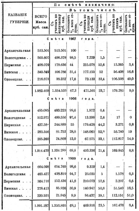 Из нижепомещенной на следующей странице таблицы ежегодных сметных назначений по этим губерниям видно: 1) что в общем итоге преобладающим способом отпуска является учет по количеству заготовленных материалов — до 70%; 2) что с учетом по площади предлагается мене 25% годичнаго отпуска, а с учетом по пням менее 10%; 3) что по отдельным губерниям наиболее совершенными формами отпуска отличаются лишь Вятская и еще более того Олонецкая, где преобладают продажи с учетом по пням и по площади и, наконец, 4) что за исключением Олонецкой губ. за все последнее трехлетие никаких существенных перемен в отношении перехода к более совершенным способам отпуска леса здесь сделано не было, за исключением разве только отвода мест рубок, ограничиваемых теперь квартальной сетью или визирами вместо прежних целыми живыми урочищами.