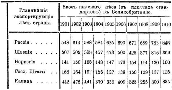 Хотя, как показывают приведенный цифры, Россия занимала в течете всего разсматриваемаго периода главное место по вывозу пиленых материалов на великобританский рынок, чрезвычайно дорожащей нашим лесом, но, все-же, только в последние отчетные годы указанное положение России стало совершенно безспорным; из данных таблицы видно, как падал экспорт леса в Англию из скандинавских стран, побивавших России в 1901 г., а в 1910 г. экспортировавших лишь около половины количества лиса, вывезеннаго из русских портов, из Соединенных Штатов и даже из Канады, сократившей в 1910 г. отпуск леса на упомянутый рынок по сравнению с 1901 г. почти на 25 %.