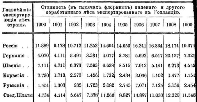 Тоже явление возможно констатировать и в отношении рынка Голландии, уже издавна предпочитающаго руссий обработанный лес лесным материалам, получаемым из других стран, что можно видеть из следующих цифр, показывающих ценность (во флоринах) пиленаго леса экспортированнаго в Голландию в период с 1900 по 1909 г.