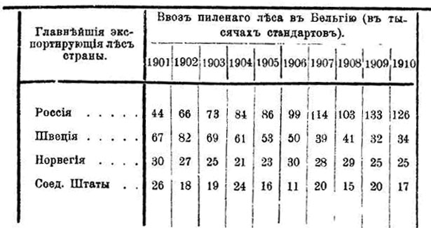 На лесном рынке Бельгии русский пиленый лес также завоевал доминирующее положение, о чем можно судить по следующим данным цитированнаго выше статистическаго сборника.