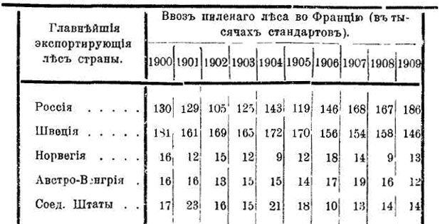 Из этой таблицы видно, что Россия (даже без Финляндии), занимавшая в 1901 г. только третье место по экспорту пиленаго леса, стала в 1910 г. на первое, далеко оставив за собой главных соперников—Скандинавския страны, Канаду и Соединенные Штаты. Последние, правда, экспортировали в 1910 г. до миллиона стандартов, но в виду громаднаго роста собственной, потребляющей лес, промышленности и значительнаго истощения лесов, в близком будущем можно ожидать скорее сокращения экспорта обработаннаго леса из Соединенных Штатов, нежели его возрастания.