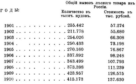 Из сделаннаго краткаго обзора положения России на международном рынке по сбыту наиболее ценных лесных материалов видно, что положение это можно считать упрочившимся. Указанный факт подтверждают и цифры роста общаго нашего лесного экспорта, особенно заметно обозначившаяся в последние годы. Об этом свидетельствуют следующия цифры, извлеченныя из отчетов Департамента Таможенных Сборов за десятилетие с 1901 по 1910 год.