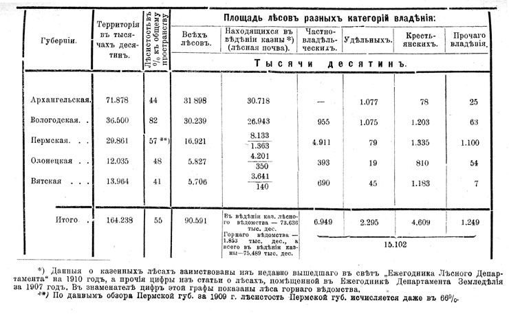 В пяти северных губерниях частновладельческие леса почти отсутствуют; государственное лесовладение занимает площадь — по Вологодской губ. около 90% (26,9 миллионов дес. удобн. л. площ.), по Архангельской—97% (30,7 миллионов дес. уд. л. пл.), по Олонецкой 90,5% (4,4 мил. дес.) и лишь по Пермской и Вятской губ. по 54% с лишним (Пермской 8,3 мил. дес. и Вятской—3,7 мил. дес.); но, если исключить из общей лесной площади горнозаводския, казенныя и частныя дачи, из которых отпуск леса производится главным образом на удовлетворение своих заводских надобностей, а также все посессионныя, из коих продажа леса на сторону запрещена, огромное преобладание государственных лесов и в последних двух губерниях станет несомненным.