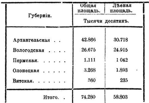 Цифры вышеприведенной таблички ясно показывают, что главная масса лесной площади, находящейся в ведении казеннаго лесного ведомства и тяготеющей по сбыту пиловочнаго леса через порта Белаго моря и Ледовитаго океана на заграничные рынки, расположена в Архангельской и Вологодской губ., где имеется до 55.633 тыс. дес. (96%). Об относительном значении этого лесного богатства можно судить уже по тому, что эта площадь более нежели вдвое превышает пространство всех лесов Швеции и Норвегии (около 26.000 тыс. дес), вместе взятых.