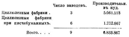 Производство в России древесной массы составляет 3,6 милл. пуд. Против начала истекшаго десятилия оно, правда, удвоилось, но в общем все-же весьма незначительно. В больших размерах развито целлюлезное производство, которое для 1908 г. выражается следующими цифрами: