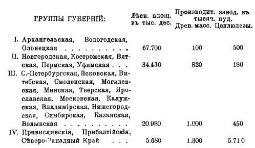 Производство всего более развито там, где всего меньше имеется леса. Больше всего заводов в Лифляндской губернии, которая по абсолютной и относительной площади лесов занимает второстепенное место. В губерниях же наиболее богатых лесной площадью — Архангельской, Вологодской и Олонецкой — имеются всего лишь три завода: 2 древесной массы и картона с годовым производством в 100 тыс. пуд. (Олонецк. губ.) и один целлюлезный (Вологодская губ.) с производством в 500 тыс. пуд. 0тметим кстати, что в северных губерниях почти все леса принадлежат казне, а в Лифляндской губернии преобладающее количество (84%) приходится на долю частных владельцев.