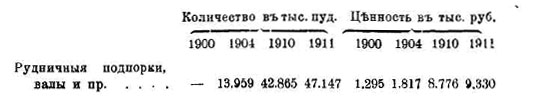 В деле вывоза мелкаго леса заграницу С.-Петербург много успел. Архангельск от него сильно отстает в этом отношении; об этом можно судить по следующей таблице, в которой представлен вывоз за ряд лет пропсов и балансов из обоих портов (в куб. саж.):