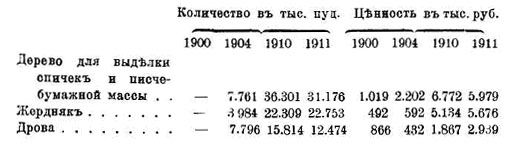 Сравнивая эти, так сказать, новыя отрасли с древообделочной, мы видим, что последняя делает более быстрые успехи в своем развитии как на севере, так и в других районах. Но наряду с ростом производства и отпуска пиленых материалов наблюдается непрерывное увеличение экспорта заграницу мелкаго леса, в том числе и целлюлезнаго, о чем можно судить по следующей таблице, в которой обозначены количество и ценность вывезенных из России (по европейской границе) рудничных подпорок, валов, дерева для выделки писчебумажной массы и спичек, жердняка и дров за 1900—1911 г.г.