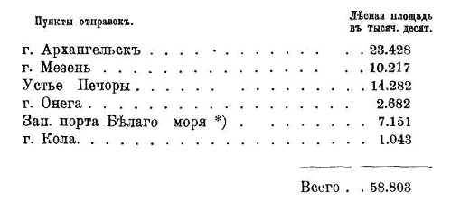В отношение траспортных путей Север Европейской России делится на бассейны следующих главнейших рек: Северной Двины, Мезени, Печоры, Выга, Кеми, Керети, Ковды и Умбы. Лесная площадь этих бассейнов, соответственно пунктов отправки, распределяется следующим образом, включая сюда и г. Колу, через который фактически, за отсутствием спроса, лес пока не отправлялся.