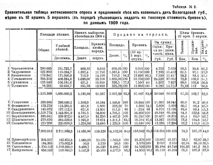 I. Обращаясь к важнейшему и наиболее острому вопросу лесного дела на Севере, а именно к жалобам лесопромышленников на недостаточный отпуск леса для нужд их лесопильных заводов, следует указать, что в этом вопросе, в самое последнее впрочем время, намечается путь, который мог бы привести к его благополучному разрешению. В неоднократно в настоящем труде цитировавшемся отчете Директора Лесного Департамента г. Кублицкаго-Пиоттух и Вице-Инспектора Корпуса Лесничих г. Назарова указаны меры, которыя в значительной степени могли бы смягчить ощущаемый беломорской лесопромышленностью недостаток в лесе. Для этого необходимо ввести в хозяйство на пиловочный лес до 18,4 милл. дес. лесной площади, признававшейся во время изследования — отчасти непригодной для выращивания пиловочнаго леса, а отчасти составляющей пространства, на которых в период изследования не было пиловочных деревьев размеров, соответствовавших тогдашним требованиям рынка.