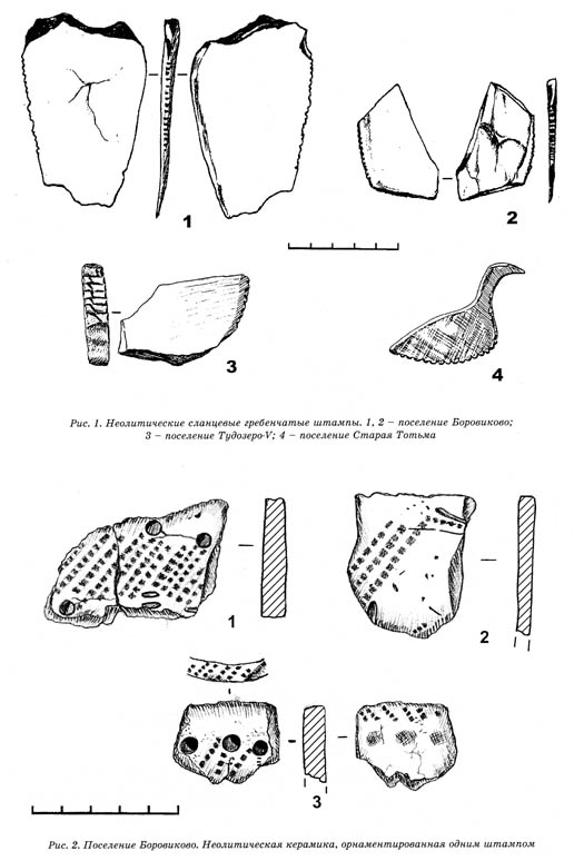 В ходе полевого сезона 2001 года на поселении Боровиково были найдены 2 сланцевых штампа. Первый штамп происходит из неолитического слоя многослойного поселения Боровиково-А. Он был найден в верхней части темно-коричневого суглинка, в котором залегала основная масса ямочно-гребенчатой керамики. Размеры сланцевой плитки, послужившей основой для инструмента – 6x5 см, максимальная толщина – 0,5 см. Надпилы, формирующие зубчатый край, нанесены на самую узкую кромку плитки (рис. 1:1). Ширина гребенчатого отпечатка составляет 0,3 см. В профиле кромка имеет округлую форму, вероятно, это связано с тем, что перед формированием зубцов край плитки подкорректировали трением о твердую поверхность. Длина непрерывного гребенчатого оттиска данного штампа составляет 3,5 см. Зубчики остроугольные, размером от 0,1 до 0,3 см, пропилены на глубину 1 – 2 мм. Линейные следы, оставшиеся в промежутках между зубчиками, позволяют точно проследить движение кремневой пилки, которой производилась обработка. Характер расположения линейных следов, оставленных пилкой, показывает, что канавка между зубчиками формировалась в два этапа. Сначала делался небольшой надпил торца плитки с одной стороны, затем действие дублировалось с другой стороны. Характерная особенность зубчатого лезвия (два одинаковых массивных зубчика и следующие за ними два маловыраженных) делает оттиски штампа хорошо узнаваемыми.
