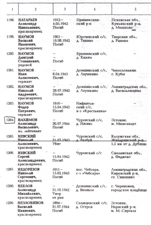 5 Именной список военнослужащих, захороненных на воинских кладбищах города Сокол в годы Великой Отечественной войны 1941-1945 годов. Л. 1-32; Список раненых и больных бойцов и офицеров Красной Армии, умерших в госпитале №1361 в дни Великой Отечественной войны в 1941-1945 годах. Л. 33-34 (Сокольский городской архивный отдел).
